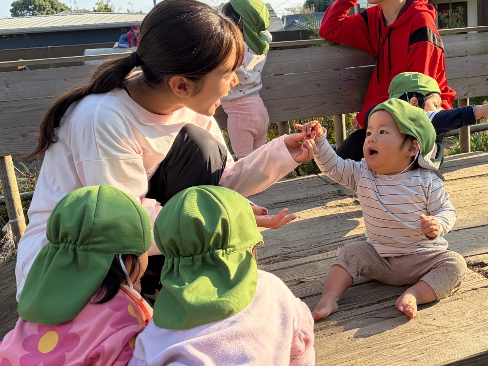 泣いたり、怒ったりして思いを表現していた子どもも、喃語が少しずつ増え、身振りや大きな声を使って気持ちを伝えようとする姿が見られるようになってきました。