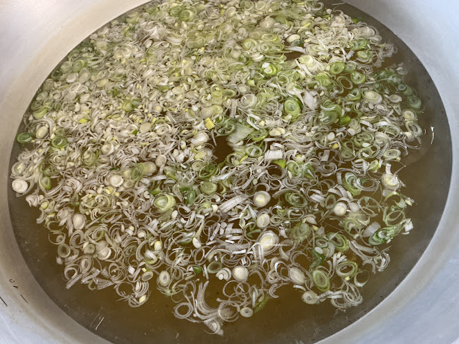 旬野菜のみそ汁には、35farmから届いた深ネギと園庭で採れた里芋と水菜が入りました。