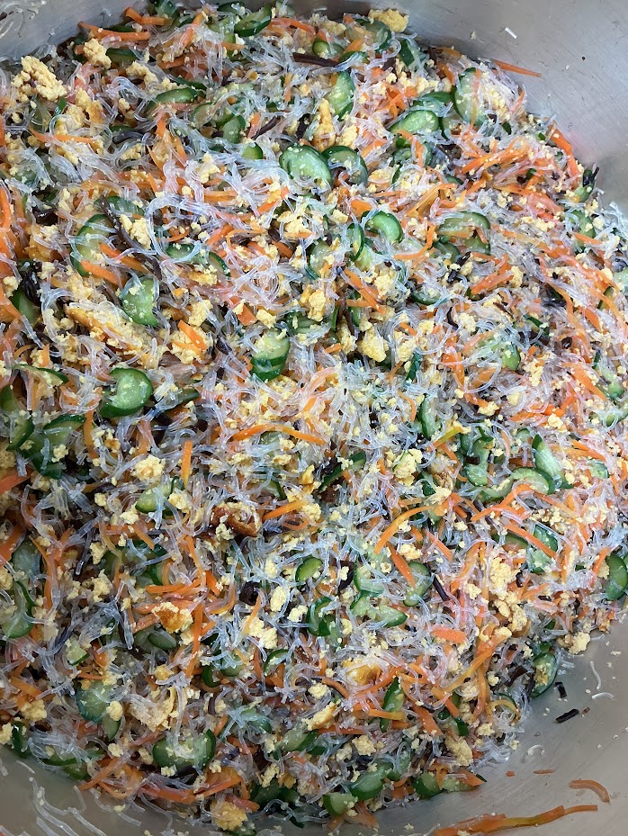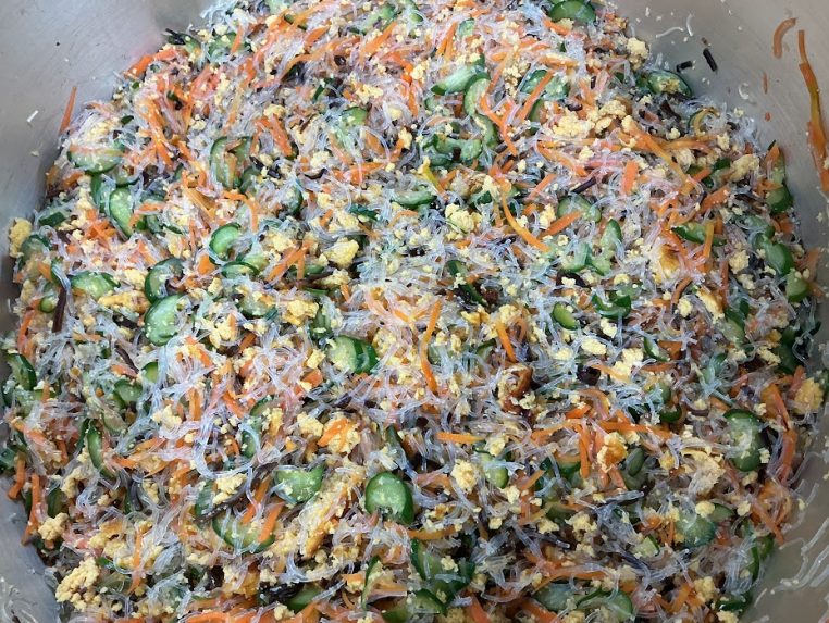 春雨の酢の物には、ヤブサメファームの卵を使った炒り卵や人参、きゅうり、下味をつけたきくらげが入り、彩り豊かな酢の物になりました。