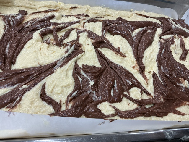 プレーン生地とココア生地を使いマーブルにしていきました。焼き上がるときれいにマーブルになるといいな…と考えながら鉄板に準備しました。