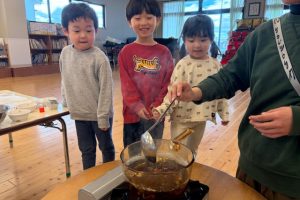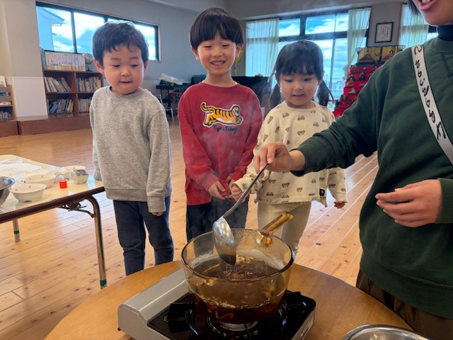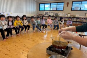 その麹調味料は、こどもたちが仕込み約2週間ほど毎日かき混ぜお世話をして、麹の香りの変化や粒の形の変化を観察して、給食で食べたり、食育活動に使ったりしています。