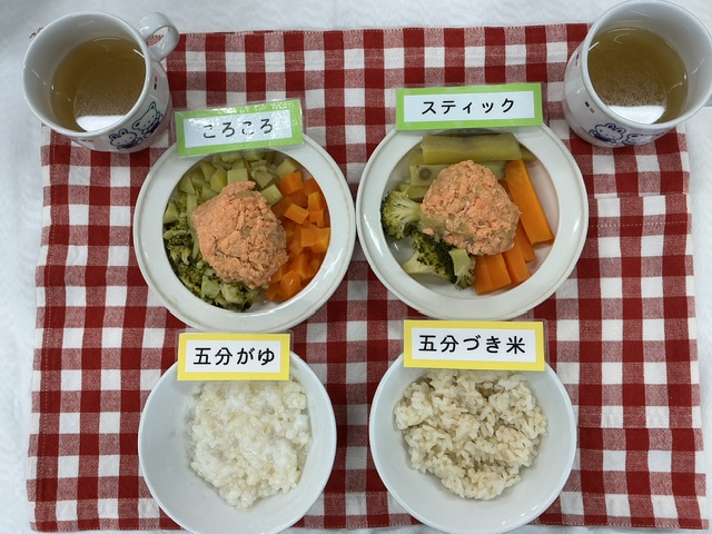 今日の離乳食は、人参、さつまいも、ブロッコリー、鮭を使用しました。