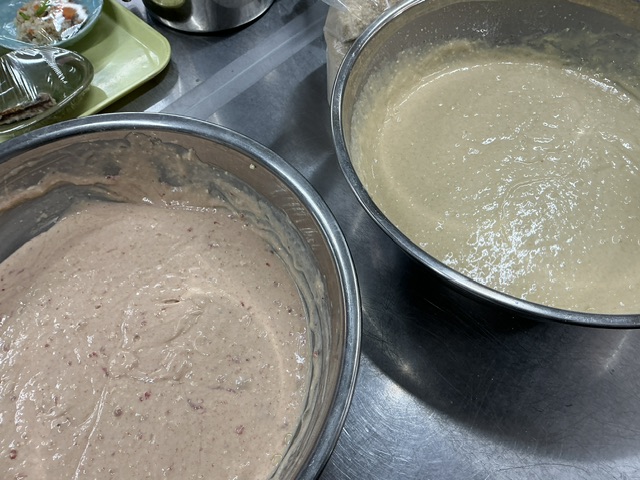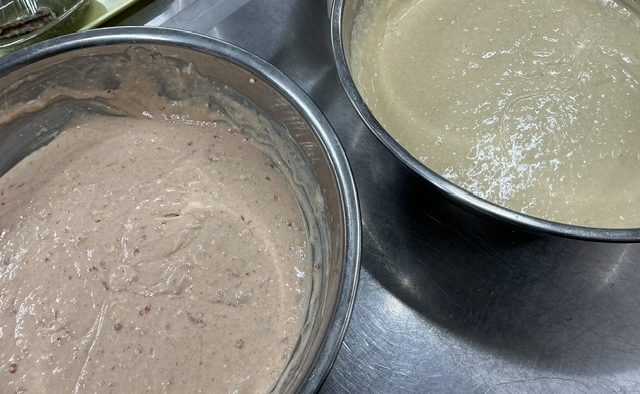 綺麗な二層になる為に、いちごジャムを使った生地を先に5分蒸して、プレーン生地を流し込みました。