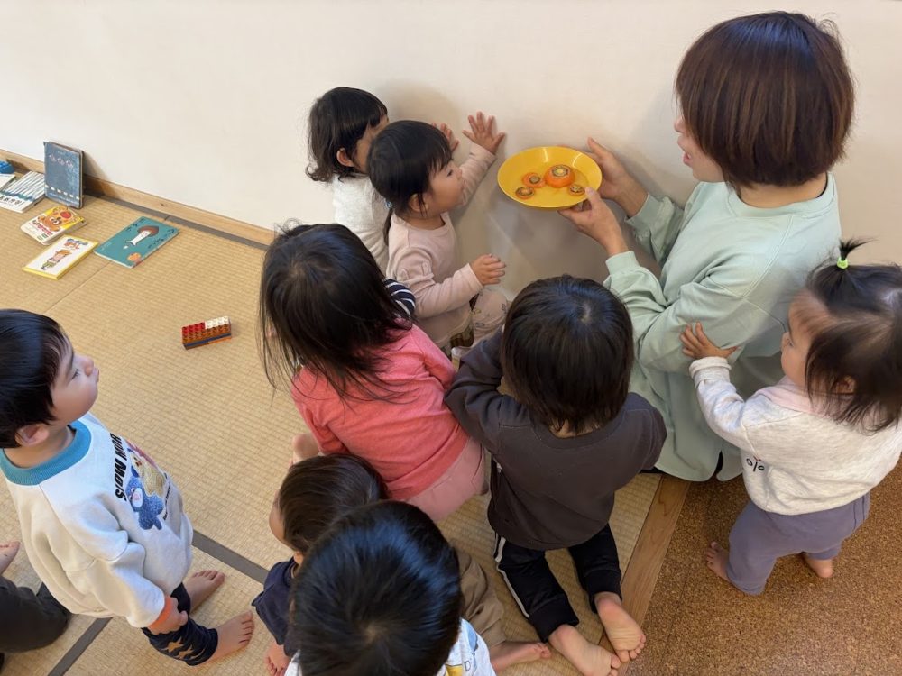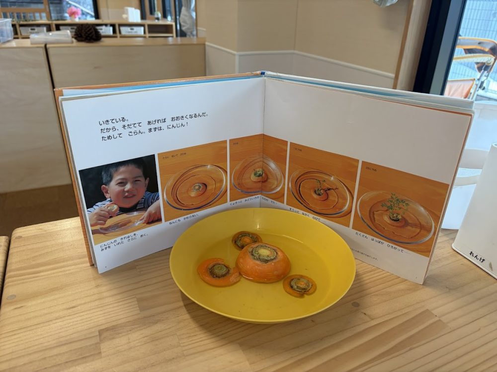 1歳児クラスが今日の人参のヘタがないか訪ねてきました。何に使うのか聞くと、絵本を見て、人参を育ててみることになったようです😲