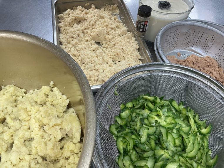 おから入りポテトサラダは、おからに味の母(みりん)と薄口醤油で下味をつけて乾煎りをしたものと、潰したじゃが芋・きゅうり・ツナ・手作りの豆乳マヨネーズを混ぜました。