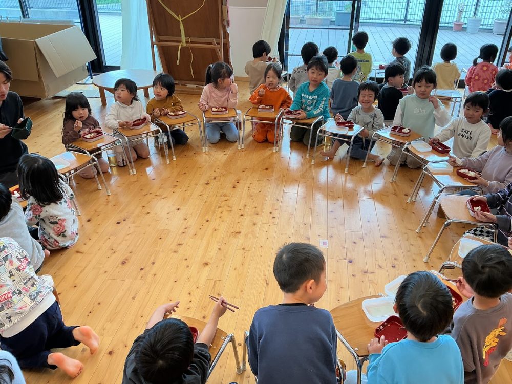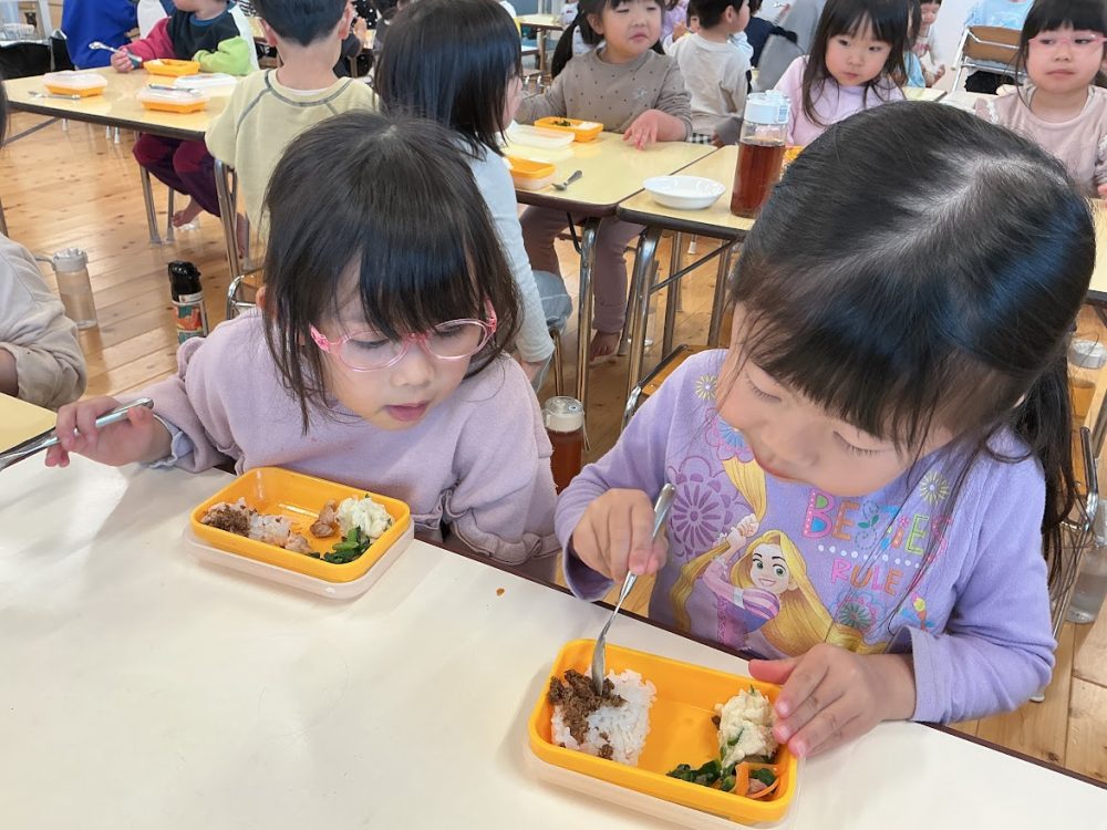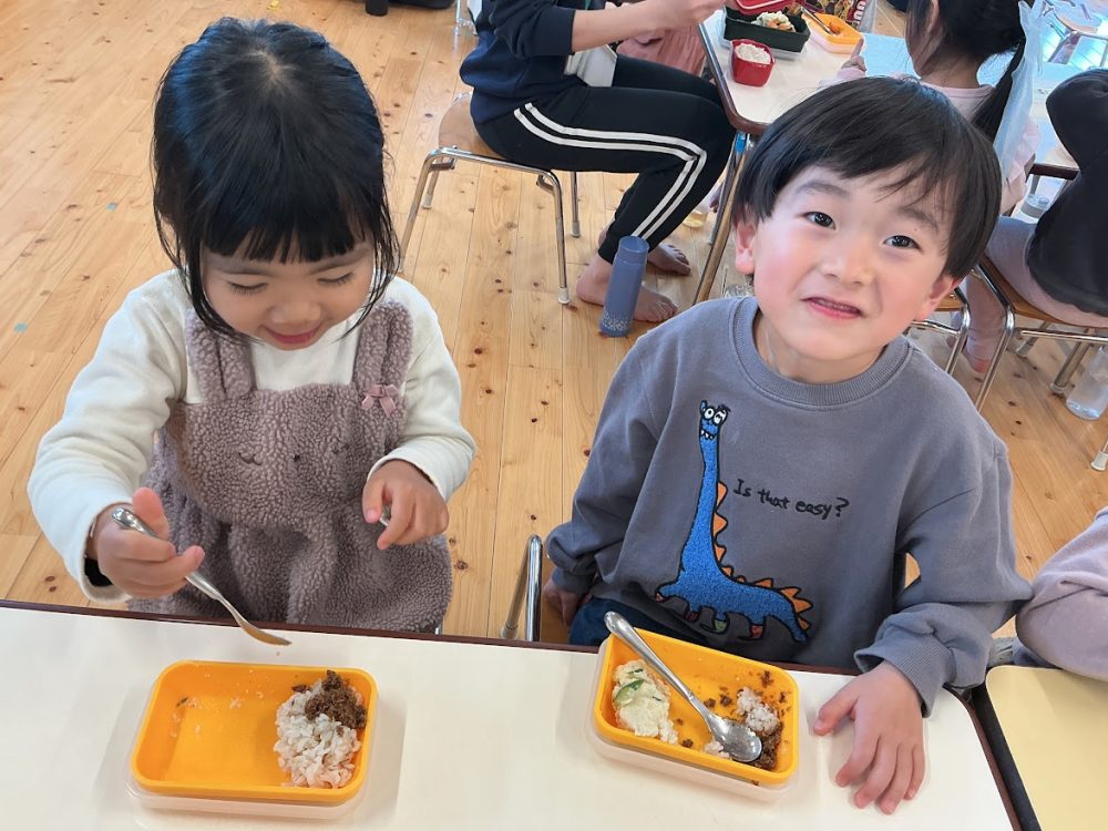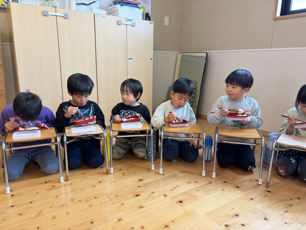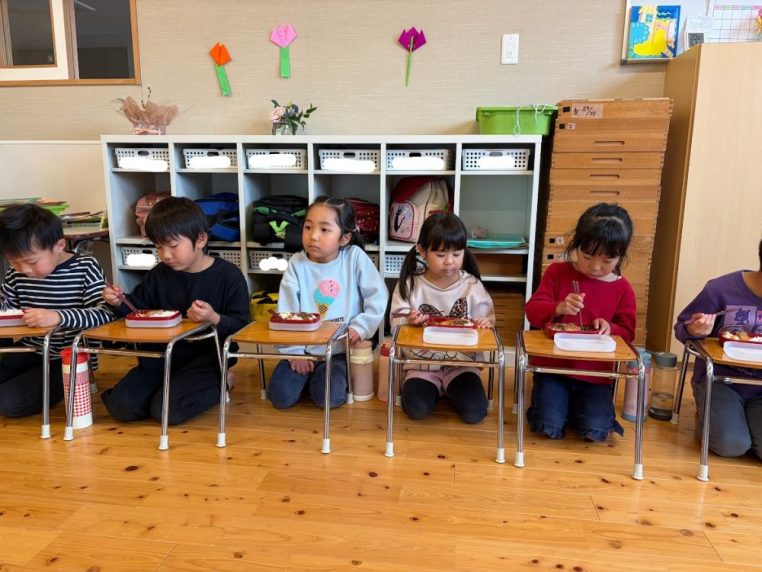年長組は、もうすぐ園舎とのお別れということもあり各クラスで食べました。
