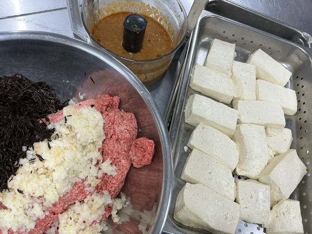 合いびき肉、一度焼いて甘くした玉ねぎ、ひじき、木綿豆腐、生姜、麦味噌、濃口醤油、きび糖で味付けしています。