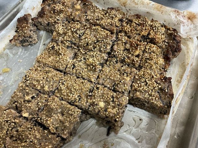 「ミートローフ」と聞くと、洋食をイメージする方もいらっしゃると思いますが、錦ヶ丘のミートローフはみそ味ベースの和食です。
