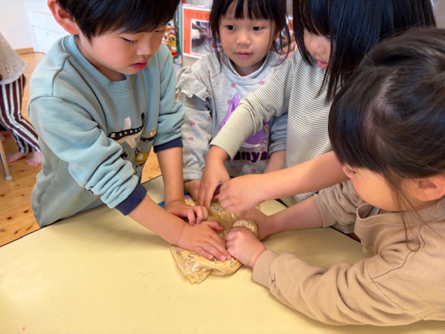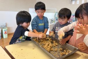 年少組(3歳児)で、2回目の味噌作りをしました。