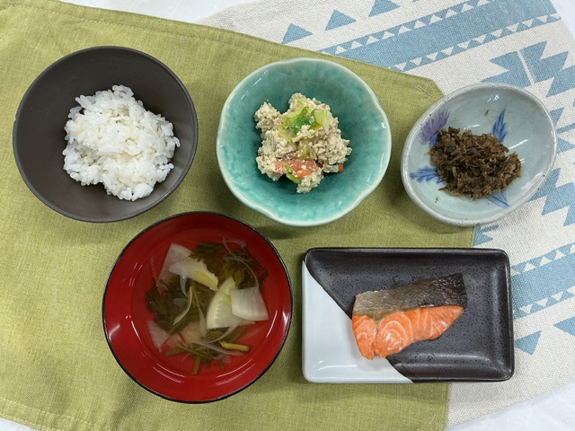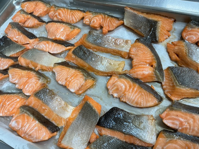 主菜は人気の鮭を使った塩焼きでした。生鮭が届くので、しっかり塩分濃度を計算して塩漬けにし、程よい塩加減になるように焼き上げています。