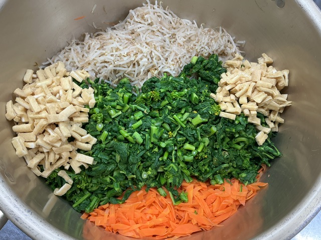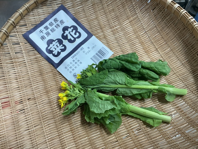 副菜は、春が旬の菜花でおかか和えを作りました。(納品の都合で、お浸しからおかか和えに変更になっています。)