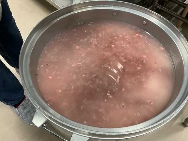 年長組が梅しごとで作った梅干しや梅酢も少し足したので、ほんのりピンク色に仕上がりました。