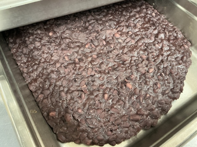 前日から小豆を浸けておき、圧力をかけ、平鍋に移してきび糖と一緒に水分をとばしていきます。