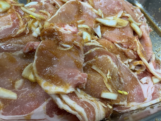 豚肉の生姜焼きに使っている肉は、鹿児島県産の豚肉です。こども達が食べやすいように、薄切りにしてもらっています。玉ねぎのスライスと一緒に漬け込むことで、お肉を柔らかくする効果があります。玉ねぎにも豚肉の旨みが染みて食べやすかったです。